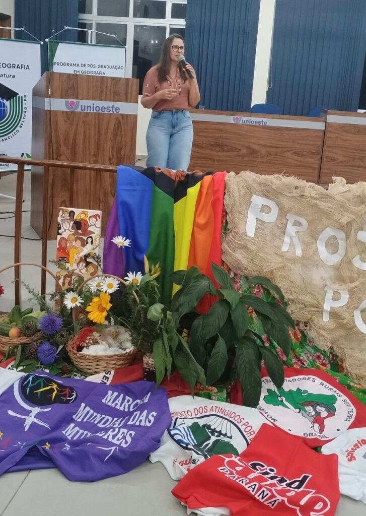 Além de Francielly, a mesa contou também com falas de Janete Fabro, produtora agroecológica da Rede Ecovida, que mostrou a sua experiência agroecológica exitosa e a sua resistência perante às adversidades relacionadas ao clima e ao preconceito contra os produtores agroecológicos e contra as mulheres.