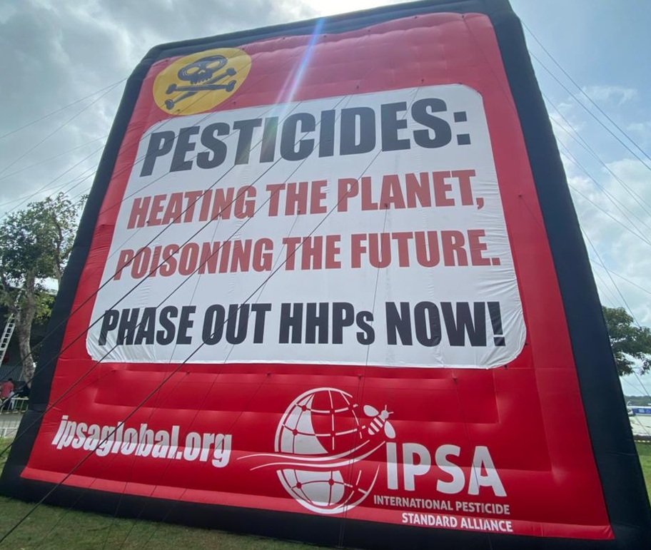 Na terça-feira pela manhã, a pesquisadora participou de um ato alertando para a necessidade do banimento dos HHPs, sigla em inglês que significa agrotóxicos altamente tóxicos, com a instalação de um inflável de 12 metros no gramado do evento.