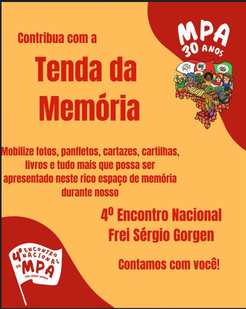 Rumo à Tenda da Memória: O 4º Encontro Nacional MPA conta com a sua história! Colabore! Saiba como no texto abaixo. O encontro será realizado entre os dias 11 e 14 de maio, no Centro Comunitário da Universidade de Brasília, em Brasília.