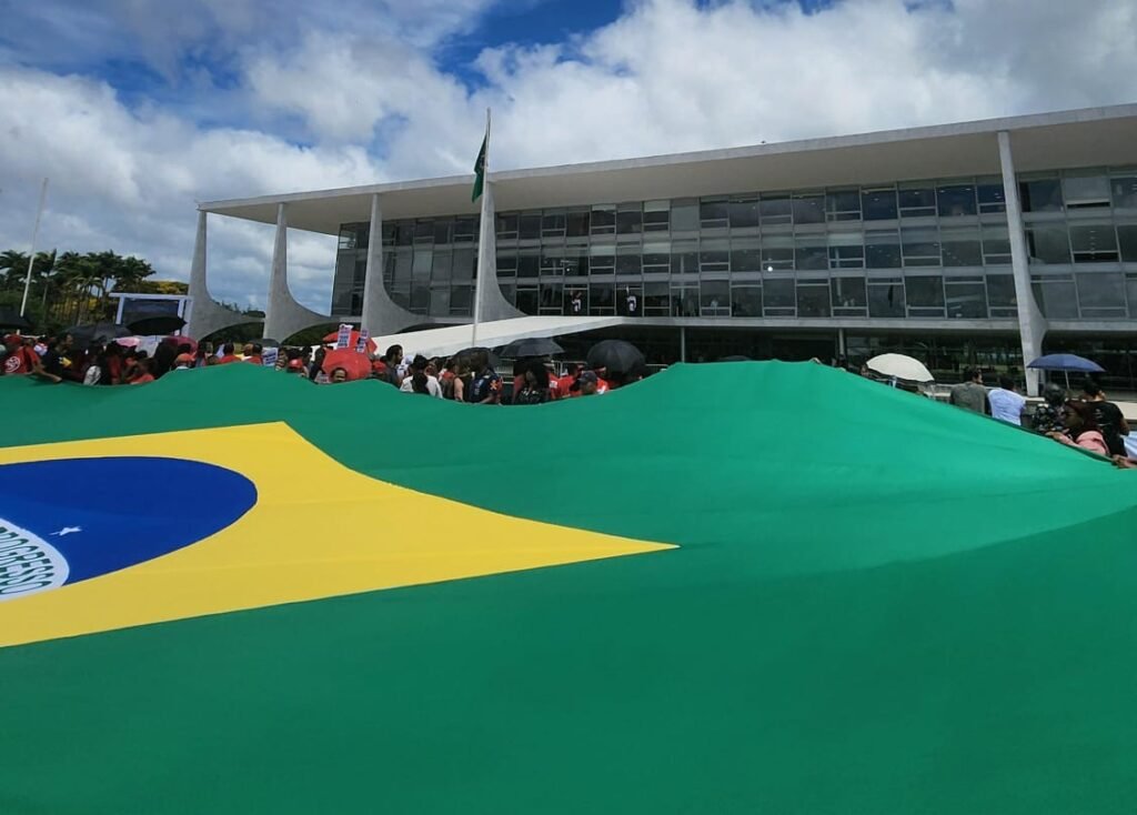 Foto da Bandeira do Brasil – O ato aconteceu ao mesmo tempo em que um evento promovido pelo governo federal para relembrar o 8 de Janeiro| Crédito: Lorenzo Santiago/Brasil de Fato