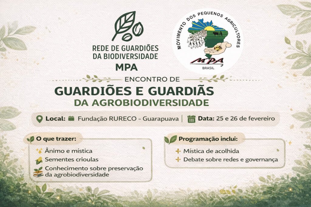 O Movimento dos Pequenos Agricultores (MPA) promove, nos dias 25 e 26 de fevereiro, o Encontro de Guardiões e Guardiãs da Agrobiodiversidade. O evento, que ocorrerá na Fundação RURECO em Guarapuava (PR), marca um momento histórico para a consolidação da Rede, com o lançamento oficial do seu Regimento Interno e do Código de Ética e Soberania.