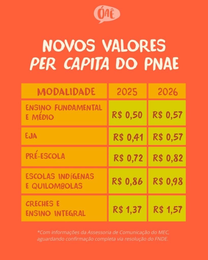 Os novos valores per capita se alinham à proposta defendida em nota técnica do ÓAÊ, sendo corrigidos com base na inflação (IPCA Alimentos e Bebidas) acumulada nos últimos três anos – quando aconteceu o último reajuste. E começam a valer desde a primeira parcela do programa para 2026.